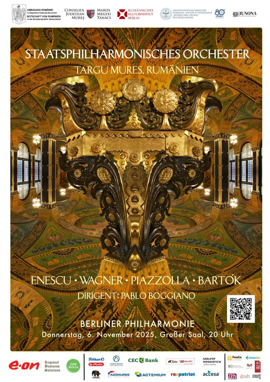 Pe 6 noiembrie 2025, de la ora 20:00, impunătoarea sală a Filarmonicii din Berlin va răsuna sub bagheta maestrului Pablo Boggiano, care va dirija Orchestra Filarmonică de Stat Târgu Mureș într-un concert extraordinar.