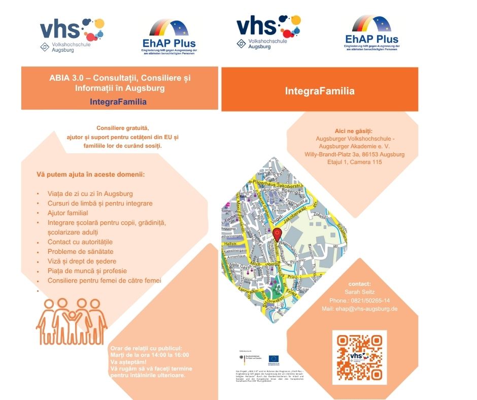 Locuieşti în Augsburg și nu știi exact unde să ceri ajutor atunci când ai nevoie? Proiectul ABIA 3.0 este aici pentru tine! Aici poți primi consultanță și sprijin gratuit, în limba ta, pentru a te descurca mai ușor în Germania.
