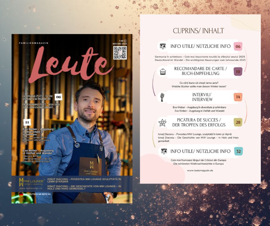 Încheiem anul cu o ediție Leute MAGAZIN care curprinde esența întregului an prin: reflecție, inspirație și descoperire. De la schimbările majore din Germania survenite la sfârşitul lui 2025 și profesiile viitorului, la recomandări de lectură potrivite sezonului rece, interviuri cu lideri locali și povești care unesc comunități, ediţia de NOV–DEC 2025 aduce împreună informație, emoție și identitate.