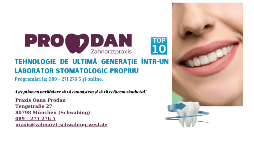 PRODAN Zahnarztpraxis, condus de Oana Mihaela Prodan, în MUNCHEN, este un exemplu de practică stomatologică modernă, dotată cu tehnologie de ultimă generație și laborator propriu. Pentru pacienți, astfel de repere înseamnă siguranță, competență și încredere. Iar în diaspora, unde recomandările bune valorează enorm, astfel de servicii devin cu atât mai importante.