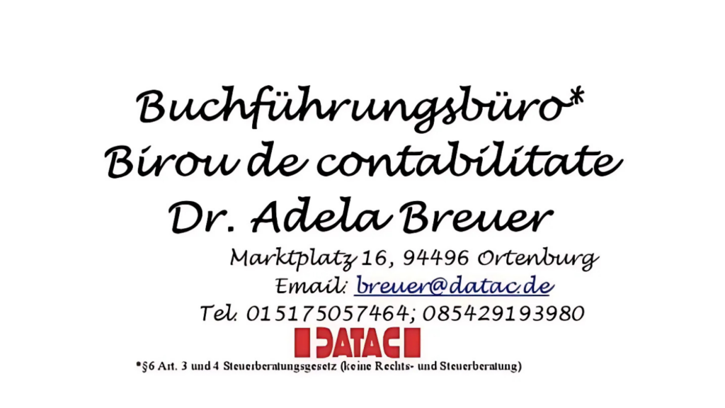 Mulțumiri speciale se îndreaptă și către Buchführungsbüro / Birou de contabilitate Dr. Adela Breuer, un partener care reflectă exact valorile pe care comunitatea noastră le apreciază: claritate, responsabilitate și consecvență. În spatele oricărei afaceri sănătoase se află, de cele mai multe ori, o bază financiară bine organizată și un contabil de încredere.